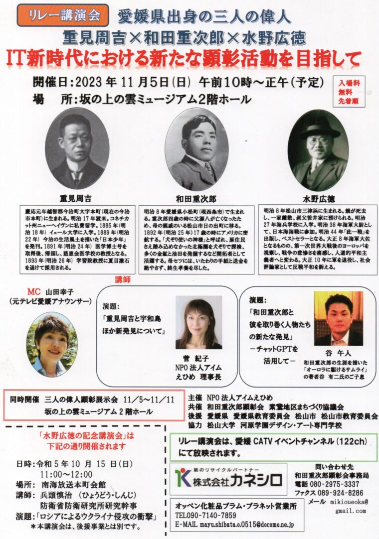 2023年11月5日に「リレー講演会 愛媛県出身の三人の偉人 重見周吉×和田重次郎×水野広徳 IT新時代における新たな顕彰活動を目指して]を開催しました。